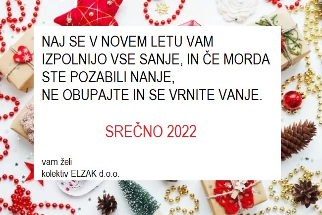 Lepe praznike in srečno 2022!Vam želi kolektiv podjetja ELZAK d.o.o.Kolektivni dopust podjetja: petek 24.12. in petek 31.12.2021Vse ostale dni delovnik od 07 do 15ure